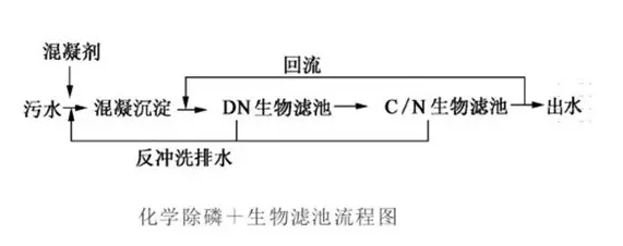 该工艺优点是工艺流程简单,控制方便;但药剂耗量较大,剩余污泥较多,同时由于混凝沉淀去除一部分有机物,有可能引起后续反硝化碳源不足。另外一种是同步沉淀与絮凝过滤,即在曝气生物滤池中投加化学药剂,沉淀物积聚在填料中,通过周期性反冲洗,将磷排出系统外,达到除磷的目的,该工艺药剂量相对较小,但是污泥被截留在曝气生物滤池内,会缩短生物滤池的运行周期,增加反冲洗的频率。